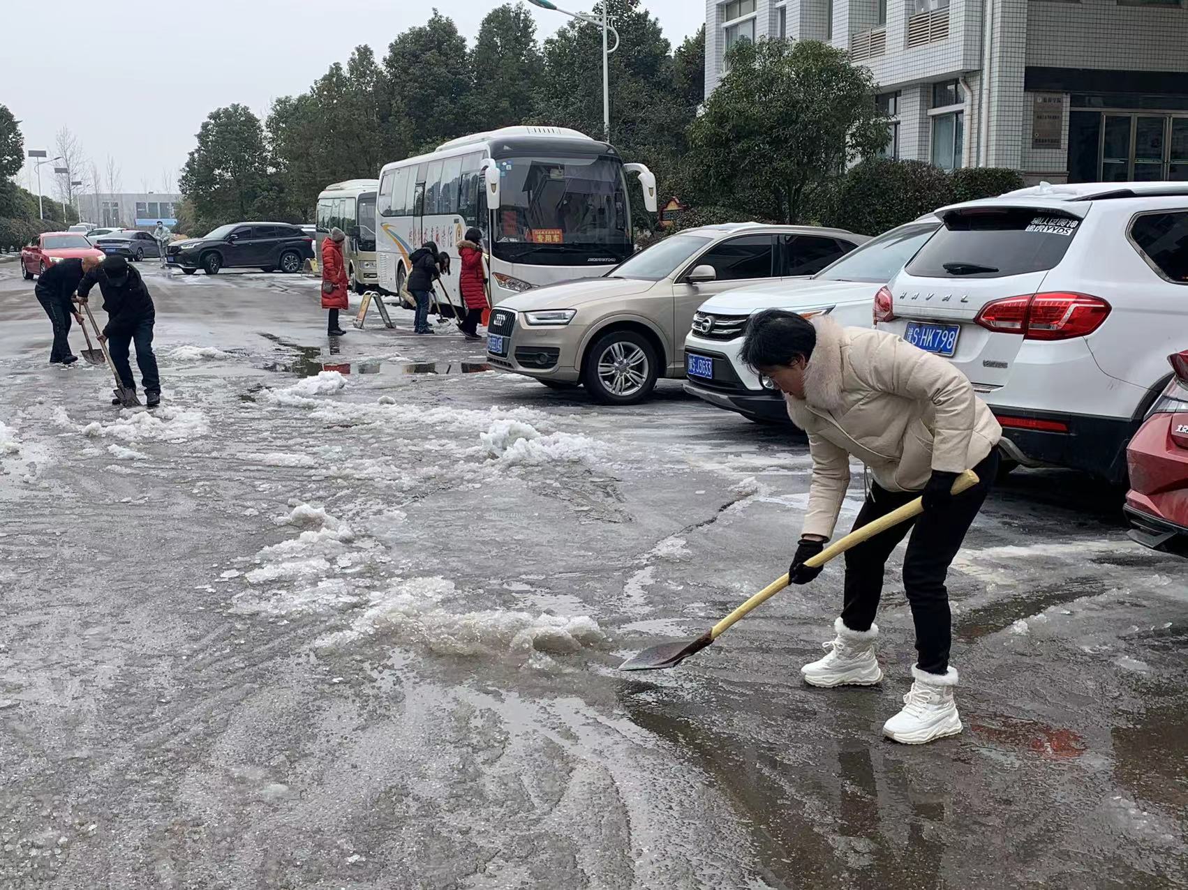 虽然天气寒冷,却丝毫抵挡不住教师们劳动的热情,上至已近退休年龄的老教师,下至入职不满一年的青年教师,大家争先恐后,你一铲我一铲,在连绵不断的沙沙铲雪声中,为护航学生返校,保障新学期平安开学团结协作,默默奉献。