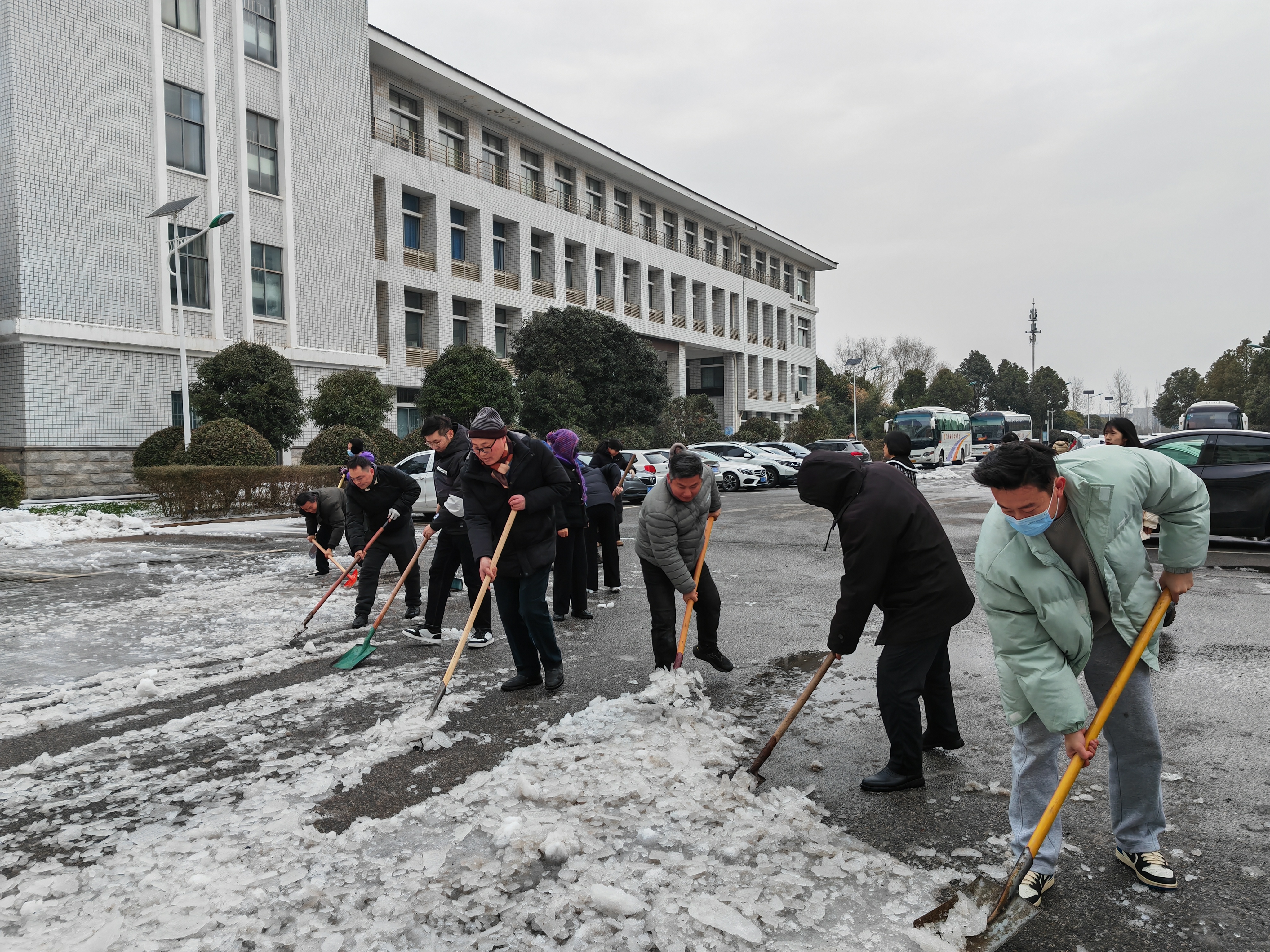 2月26日上午,beat365正版唯一官网全体已返信教师在领导班子的带领下,开展铲雪除冰行动。学院教师自发携带工具,分工协作,先铲后扫,历经一个多小时,将学院责任区域内道路及公共区域积雪清理干净。