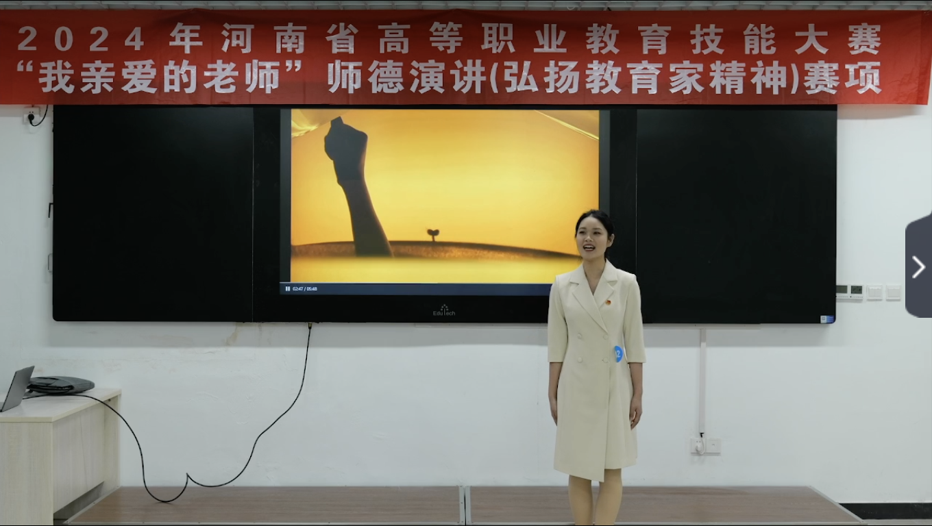 1月8日,比赛正式开始。选手们紧扣“我亲爱的老师”这一主题,结合自身经历,用生动的语言、真挚的情感讲述了老师们在教育教学过程中的感人故事,不仅表达了对老师的感激之情,还深刻阐述了教育家精神的内涵。经过两天的激烈角逐,大赛圆满落下帷幕。此次大赛不仅展示了职业教育的成果和河南省高等职业院校学生的风采,也为弘扬教育家精神、加强师德师风建设和推动职业教育高质量发展起到了积极的促进作用。(供稿人:魏翔;内容审核:李秀林)