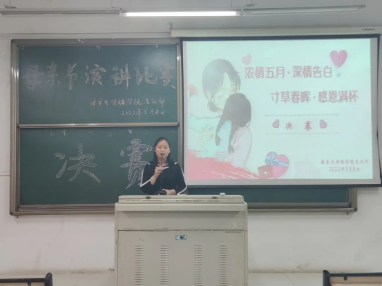 为了营造温馨的节日氛围,唤起同学们对母亲的浓浓爱意,表达对母亲的感恩之情,2022年5月8日晚上七点,beat365正版唯一官网在1219多媒体教室举办了“浓情五月·深情告白·寸草春晖·感恩满怀”母亲节演讲比赛。beat365正版唯一官网副院长蒋吉优以及辅导员王长春、苏新敬和孙闻出席本次活动并担任评委。