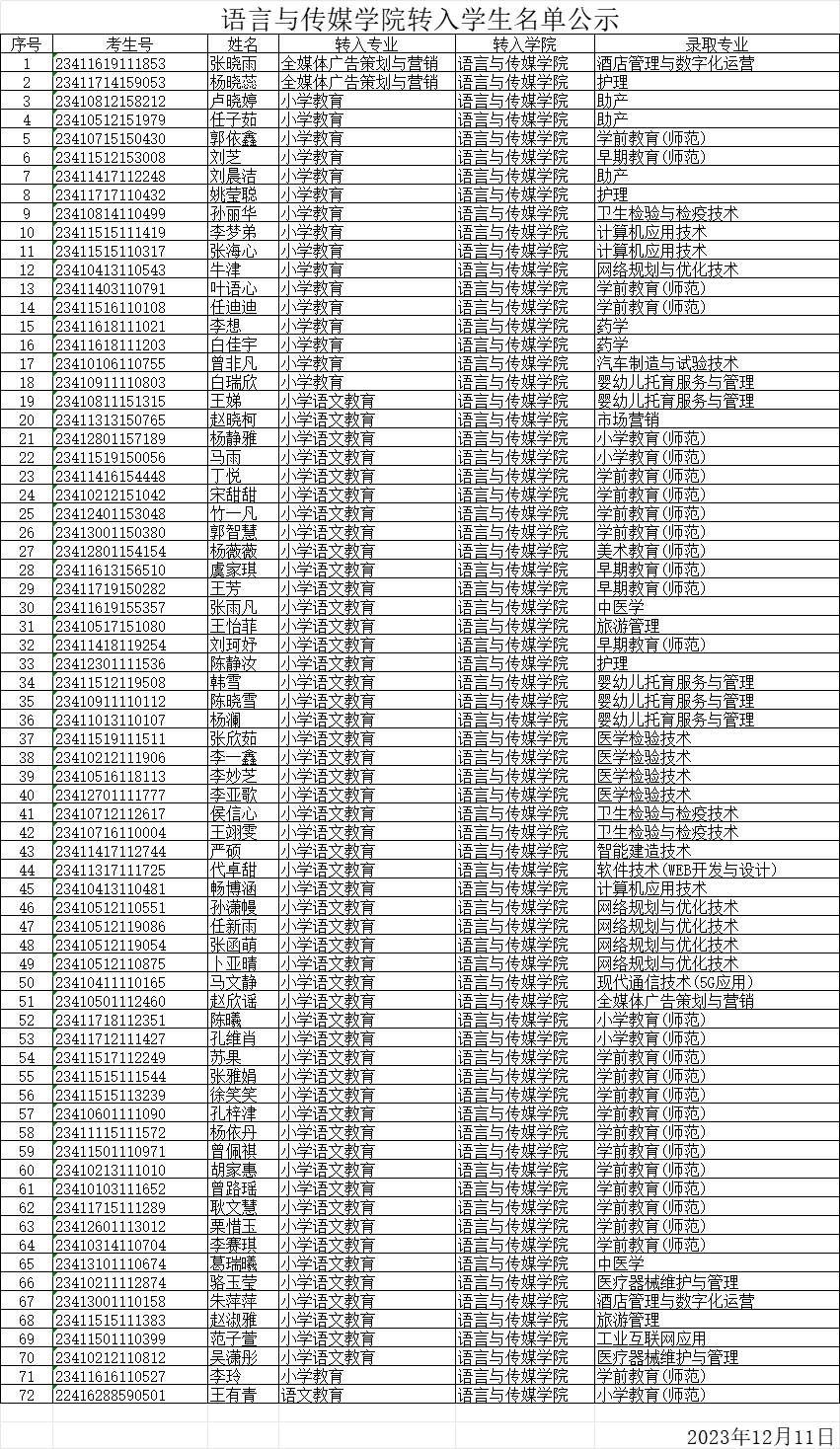 2023年beat365正版唯一官网转入学生名单公示