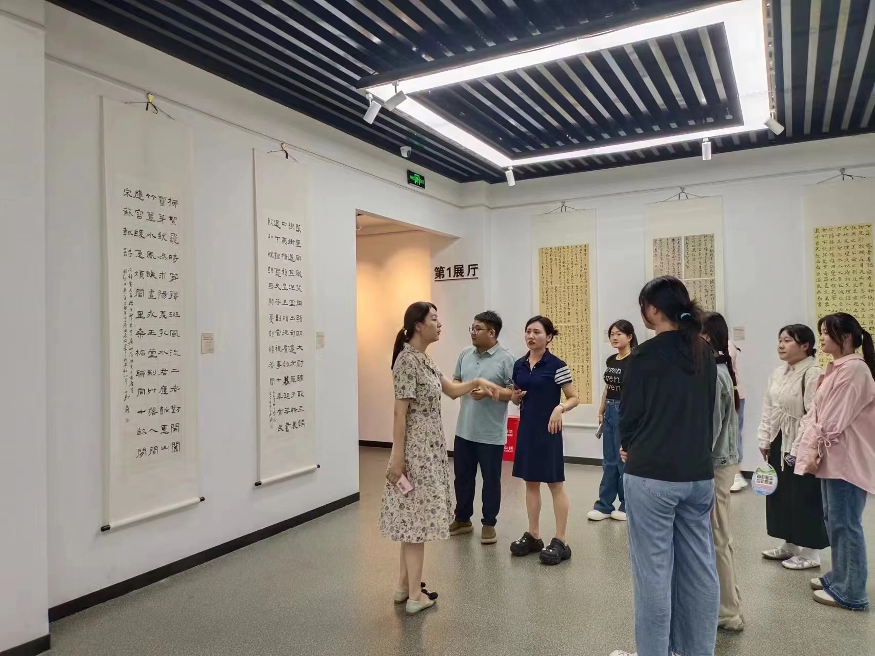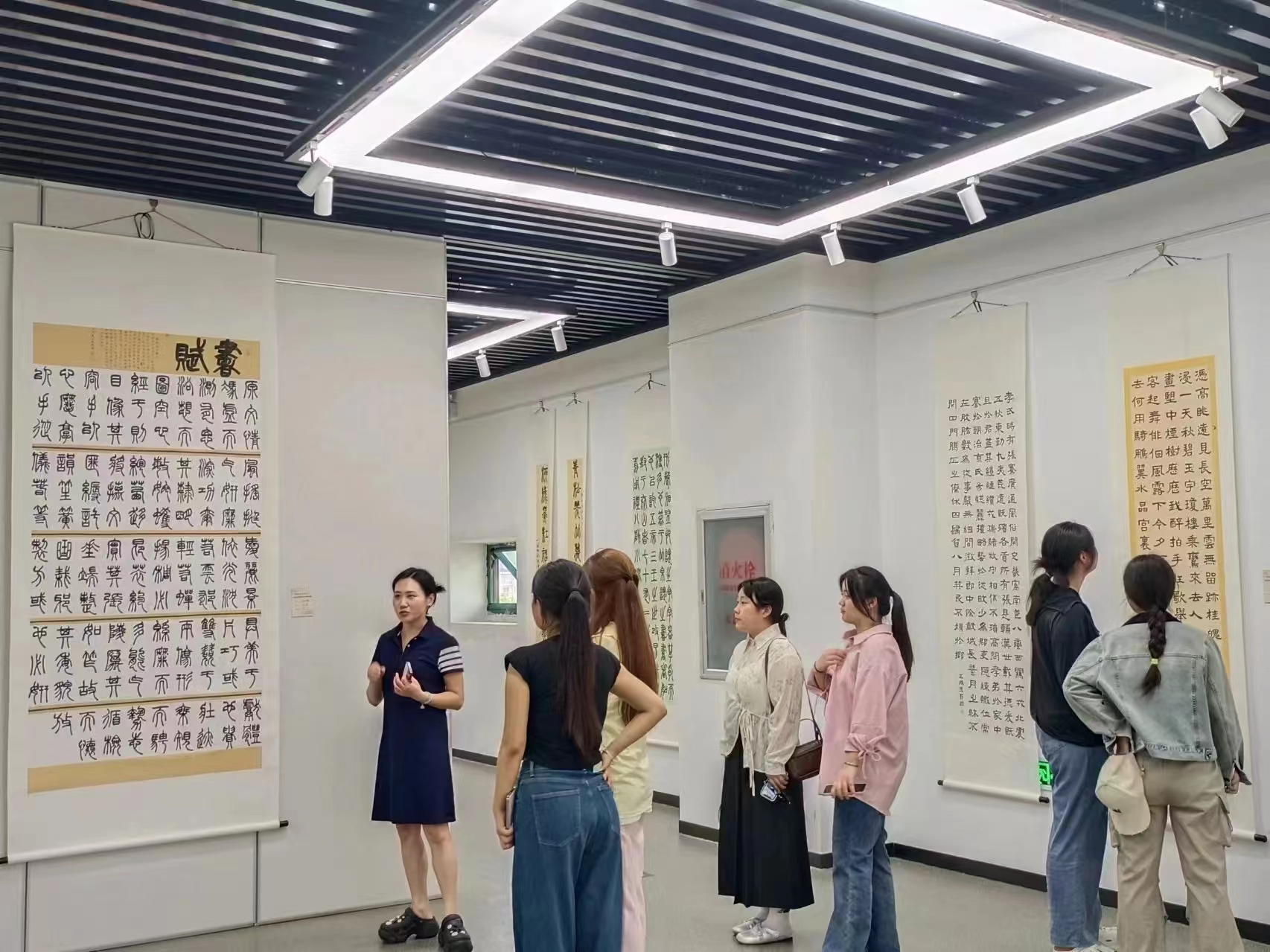 本次活动选址于信阳市书画院,师生们一同参观正在展览的书画,展内陈列着众多书法名家的作品,包括篆书、隶书、楷书、行书等多种书体,风格迥异,令人目不暇接,充分展示了书法艺术的丰富多彩。在参观过程中,老师不仅详细地为学生们讲解书法的历史、技法和审美,还详细地讲解了每幅作品的创作背景、书法技巧和艺术价值,使学生们对书法艺术有了更为全面的认识。
